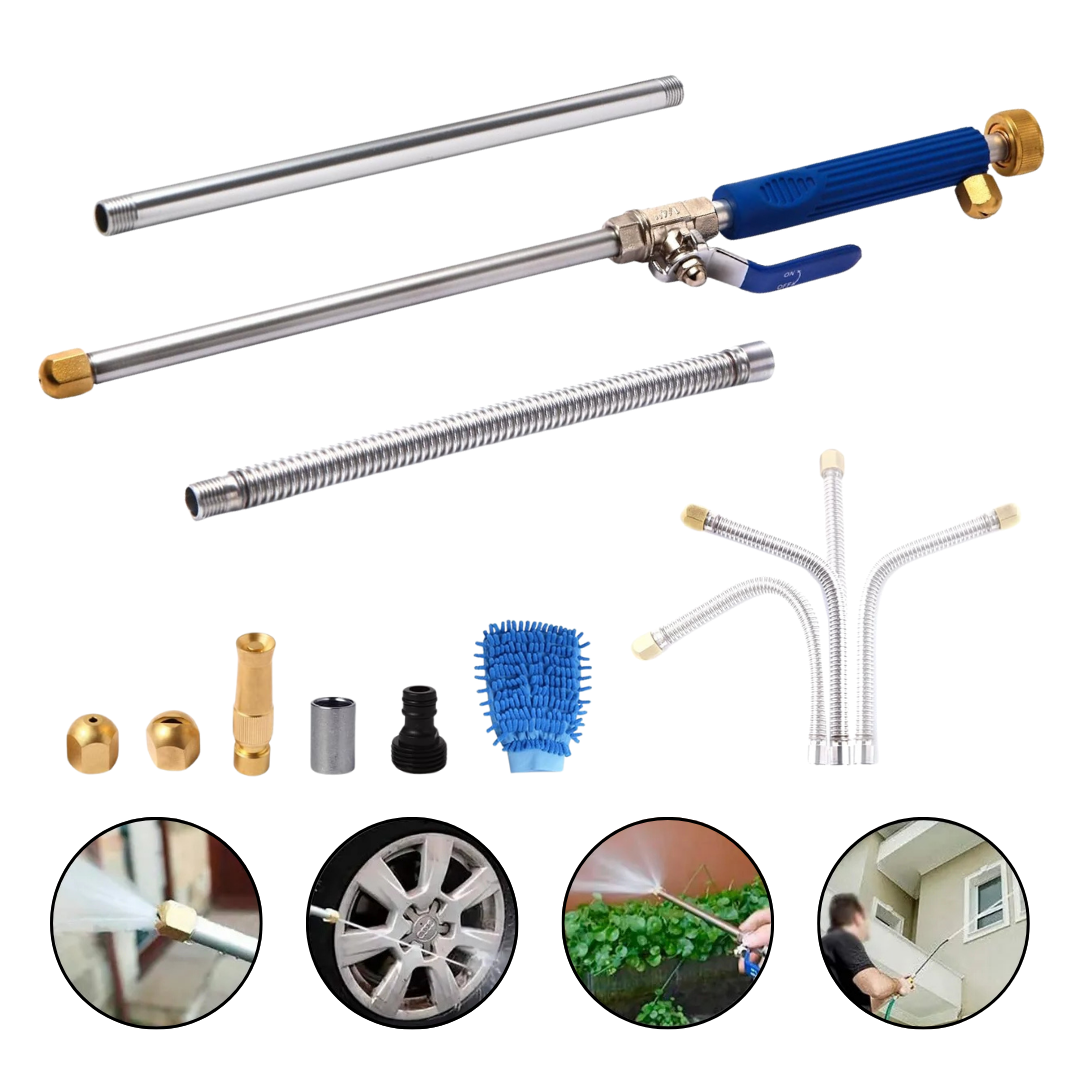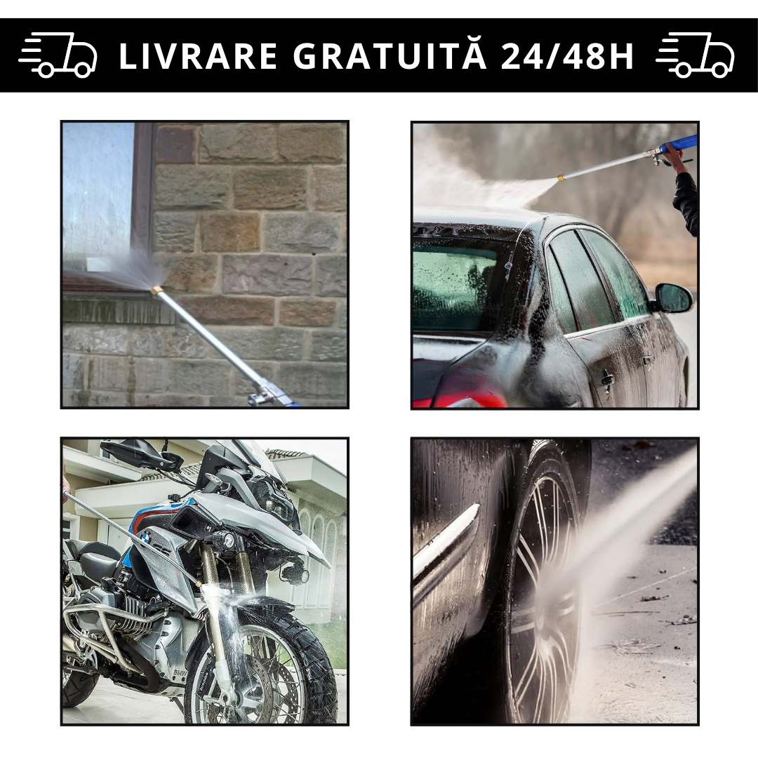 Cu Pistolul de Apă sub Presiune, transformi simplul tău furtun de grădină într-o unealtă cu putere de curățare ridicată. Perfect pentru mașini, grădină, animale de companie sau ferestre.
